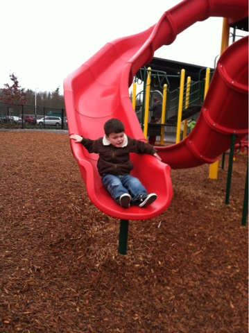Spent a few hours again with Max at school today...and he has really learned his way around the playground! Check out his sweet, silly smiles on the way down the slide! :)
